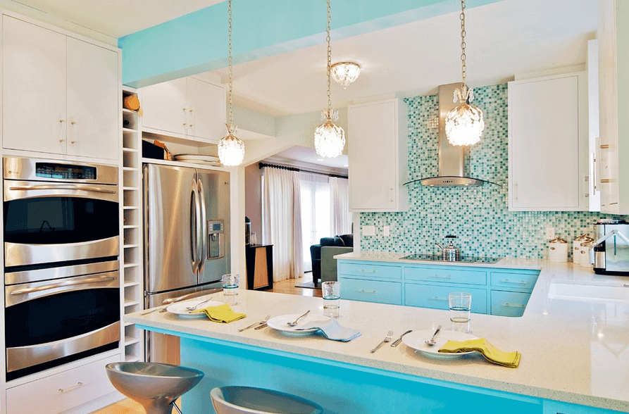 Идут споры об уместности применения голубого на кухне. Психологи утверждают, что голубой цвет способствует уменьшению потребления количества пищи, и это на руку тем, кто следит за своим питанием или хочет привести в норму вес. Но если кухня для вас – очаг тепла и уюта, и вам необходима теплая комфортная атмосфера, к тому же еще и усиливающая аппетит, то вам стоит на кухне применять голубой очень дозировано, в качестве ярких акцентов.