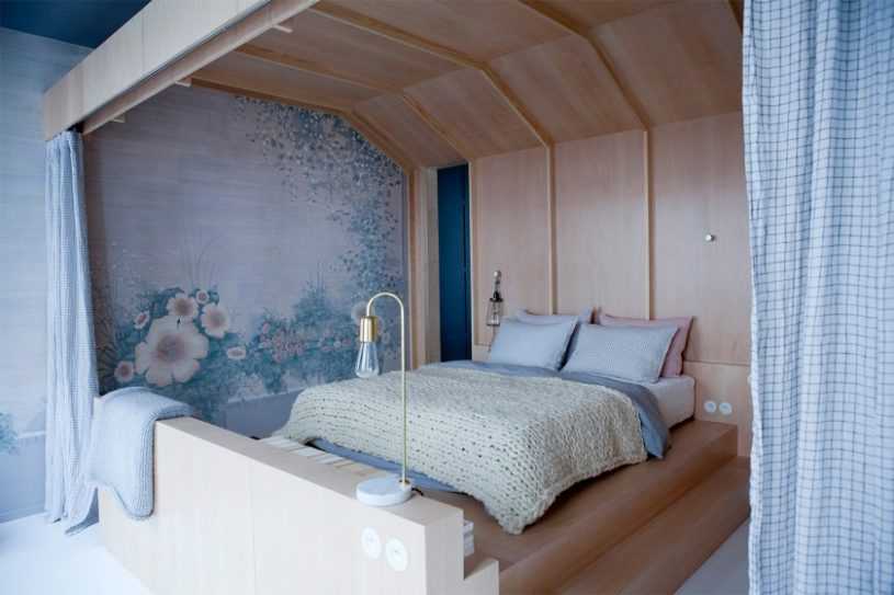 Следуя рекомендациям дизайнеров, в квартире-студии можно соорудить подиум. Но не монументальный прямоугольник из гипсокартона. Удобнее подиум-чемодан, который перед приёмом гостей складывается пополам. Внутрь убирают матрас с постелью, а большой ящик превращается в стол с бокалами и тарелками.