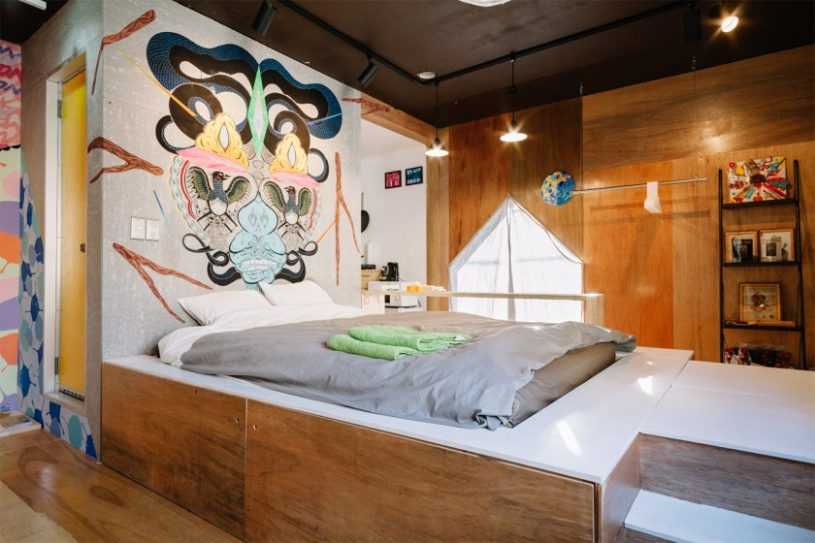 Матрас на прочном подиуме легко превратить в нестандартную гостиную. Постельные принадлежности убирают в ящик под подиумом, на матрас стелиться непромокаемое покрывало для спасения от пролитых напитков. Посередине – странная доска на ножках, на ней – блюда с закусками. Сидеть вокруг на матрасе удобно и весело. По уверениям хозяина квартиры, доска – это кровать из тропической Африки.