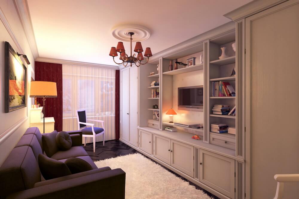 Гостиная. Как в спальне, так и в гостиной комнате лучше использовать светлые занавески. Потолок и стены оформляем в бледные или светлые цвета. Для визуального расширения отличный эффект придают натяжные потолки. Мебель выбирается функциональная, но маленькая. Нет надобности в больших диванах или громоздких креслах.