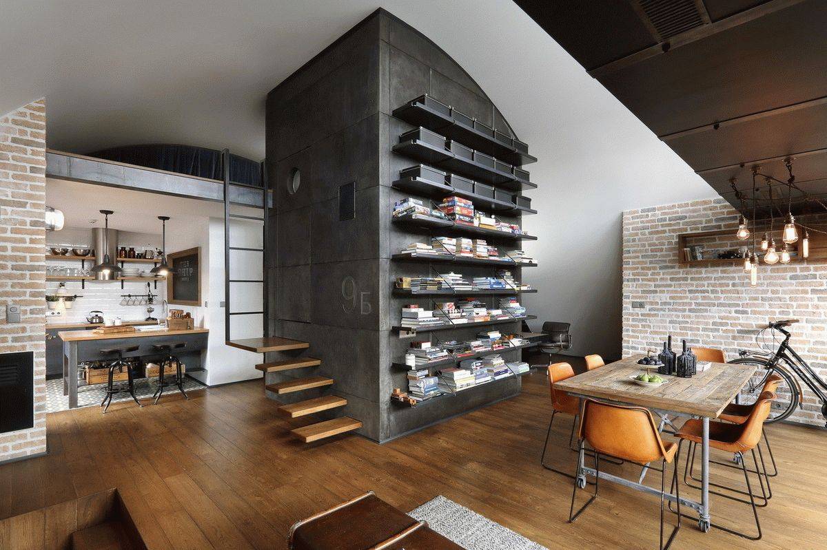 Итак, основных перегородок нет, пространство едино. Но в том случае, если в помещении присутствуют ниши, сложные углы, не стоит торопиться и сносить их. Лофт прекрасно войдёт в подобные квадратные метры. Более того, сегодня часто между кухонной и гостиной зоной устанавливают стеклянную стену с элементами металла, используют различные ширмы или стеллажи для книг. Это не только функционально, но также слегка расширяет рамки стиля – ошибки или «лишние» предметы в той или иной зоне не будут столь заметны.