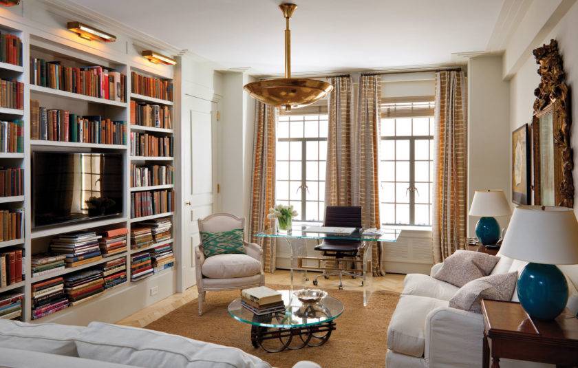 Текстиль в небольшом количестве уместен. Это обивка мебели, тяжелые портьеры и легкие красивые шторы. Цветовая палитра должны быть спокойной, чтобы уравновесить темный цвет мебели.