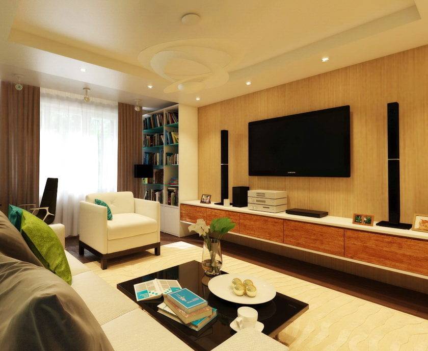 Домашний кинотеатр, большой плазменный телевизор и музыкальный центр — любая техническая новинка идеально впишется в дизайн современной гостиной в стилистике модерн.