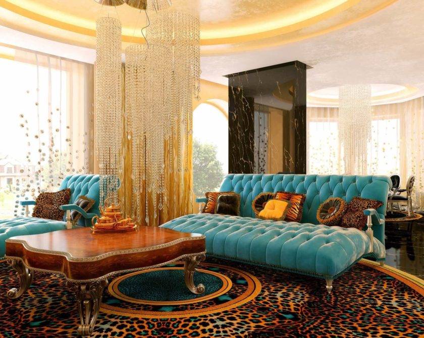Бывают смелые сочетания черной мебели с белыми стеклами, диванов и кресел самых обычных размеров с одновременной пышностью и объемом форм. В обивке мебели, шторах и обоях должно быть идеальное сочетание.