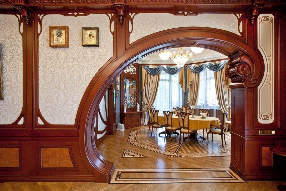 Стиль Модерн в интерьере на фото можно определить по изящным аркам вместо привычных прямоугольных дверных проемов и округлых верхних частей окон. Лестницы на верхний этаж плавно изгибаются, имеют непростую конструкцию и одновременно с этим кажутся легкими и изящными.