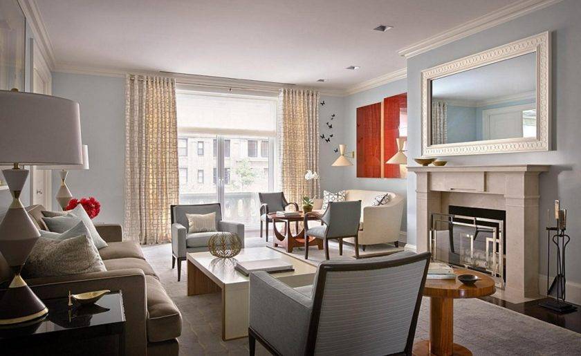 Фотоизображение говорит о том, что в целом интерьер гостиной составлен из нескольких направлений, где укладываются и современные, и эклектические, и модерновые нотки. Если говорить о дизайне стен в комнате, то они полностью соответствуют популярному и всегда уместному стилю modern: светлые пастельные серо-бежевые поверхности, выкрашенные в один тон, плюс огромные окна от пола до потолка, увешанные полупрозрачными занавесками, и зеркальные колонны, дающие замечательно светоотражение.