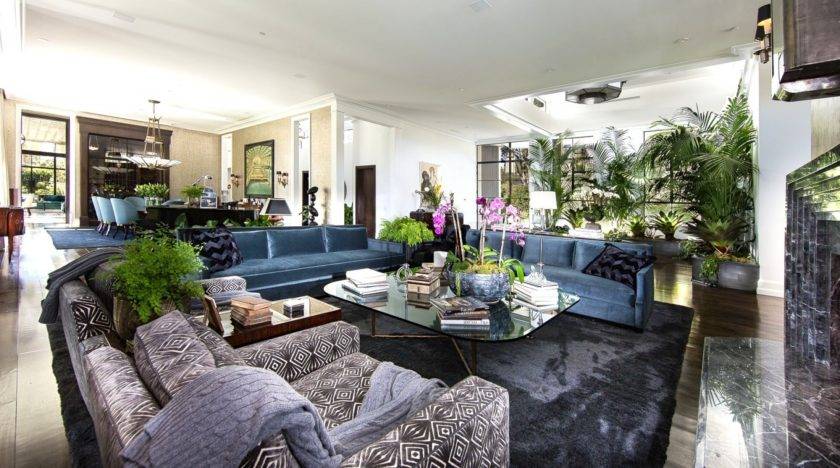 Для освещения комнаты используются точечные светильники и люстра с хрустальными подвесками Живые растения в напольных кашпо являются дополнительным цветовым акцентом Глянец голубых поверхностей мебели контрастирует с чёрными элементами