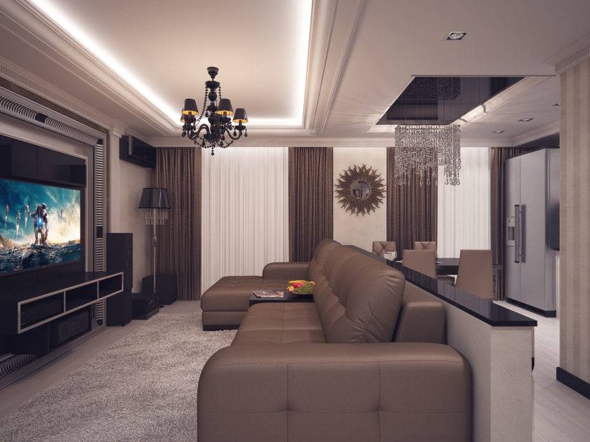 При оформлении такой комнаты особое внимание уделяется иллюминации в несколько уровней, которая направлена на подчеркивание стилистической направленности интерьера. Дизайн гостиной в стиле модерн предполагает для основного освещения использование красивой люстры или подвеса, дополнительно применяются бра на стенах, напольные торшеры