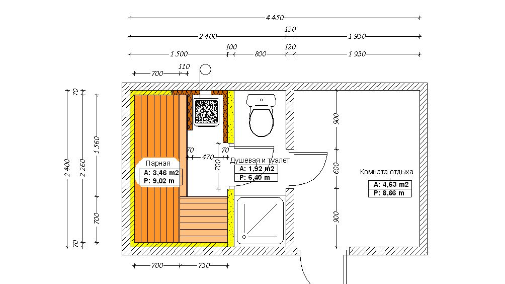 Данная схема состоит всего из 3-х частей — это парная, душевая и комната для отдыха, которая включает в себя размещение предбанника. Здесь нет никаких дополнительных помещений и ничего лишнего, баня получится обычной, с просторными и удобными комнатами.