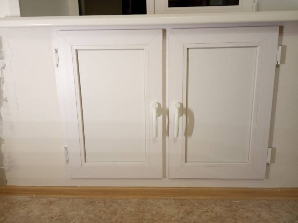Также можно использовать и материалы, из которых сделаны окна. Если оконные рама и откосы пластиковые, дверца и часть стены под оконным проемом оформляется соответственно.