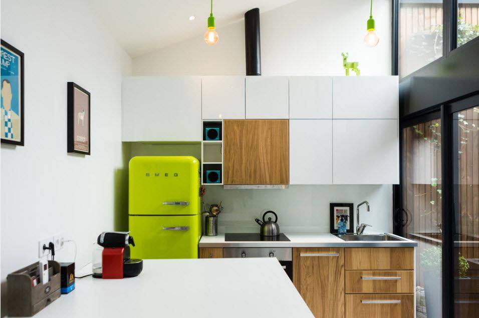 Еще один оригинальный вариант — повесить на стенку холодильника металлическую магнитную доску, и на нее крепить баночки с разноцветными специями.