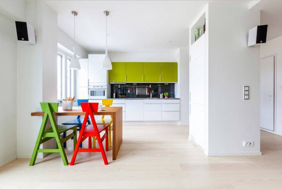 Декор в виде самоклеящихся стикеров обычно приклеивают на стены в обеденной зоне. Уместны украшения, изображающие еду, цветы, посуду, тематические надписи, геометрические фигуры.