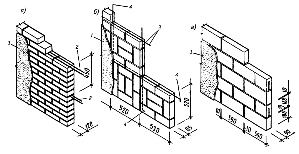 При возведении внутренних стен, являющихся несущими или перегородками, отдельные кладочные элементы можно состыковывать одним из 3 способов: