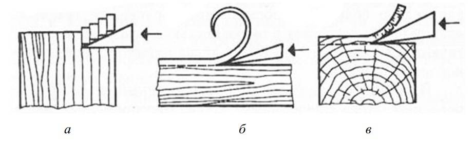 - резание поперек волокон (поперечное), которое производится в плоскости волокон, но в поперечном направлении, при этом резец не перерезает волокна, а отделяет их друг от друга (рис. 3, в).