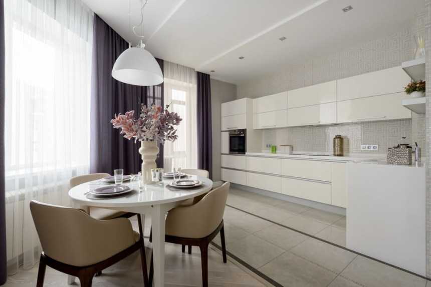 Стильно смотрится молочный или черно-белый интерьер в такой кухне. К основному светлому тону можно добавить несколько ярких акцентов. Как пример, красочные жалюзи или декорированная столешница.
