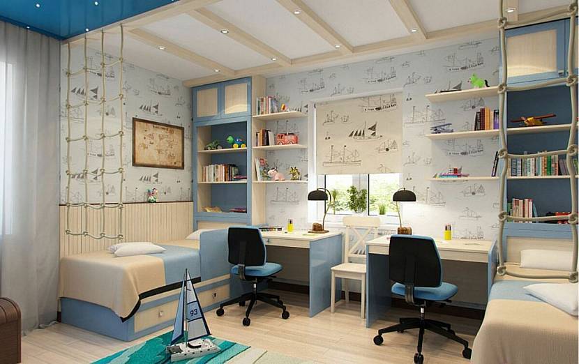 Для организации пространства для двух учеников придется постараться. Главное при этом — ни одного из детей не ущемить в плане справедливости распределения места. Для ребят примерно одного возраста и однополых делят его по принципу 50/50. Обоим одинаковые кровати, столы и стулья. Всего всем поровну, иначе дети будут постоянно соперничать, ругаться. В оформлении такого дизайна детской комнаты для школьников двухъярусная кровать станет идеальной. Это актуально для малогабаритного пространства.