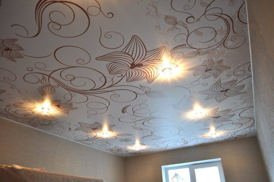 На потолке могут присутствовать лёгкие узоры. Декорирование такого типа позволяет не использовать в интерьере сложные элементы.