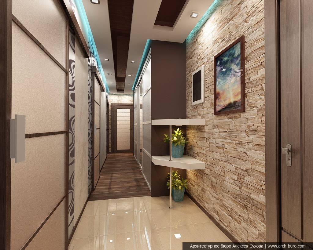 Ниже на фото мы можем увидеть фото-идеи ремонта в коридоре. Длинный коридор, как правило, влечет за собой трудности в расстановке мебели вдоль стен, или вовсе не вмещает никакую мебель. Если стены коридора слишком длинные – разумно будет поделить их на зоны. Разделение на зоны производится с помощью разно уровневых потолков или комбинирования различных покрытий для пола и стен.