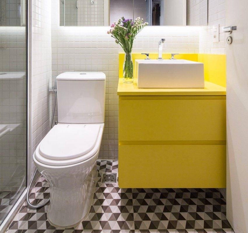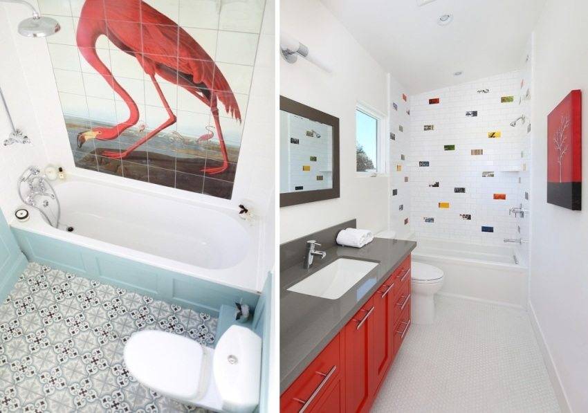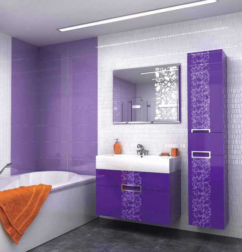Если комната получилась унылой и однообразной, то ее вполне можно украсить при помощи мебели. Яркий шкафчик или даже цветная раковина или ванна разбавят интерьер и привнесут в него сочности. Мебель лучше выбирать глянцевую. Так как она отражает очень много света, что визуально прибавит масштабности. Однако чистить ее будет сложнее. Готовьтесь к частой уборке.