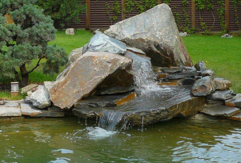 Каскад. Предполагает спуск воды по каменным «ступенькам», выполненным из характерных элементов более угловатой формы. Отлично справится с задачей гранит или сланец.