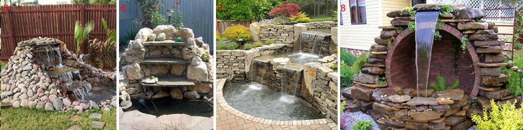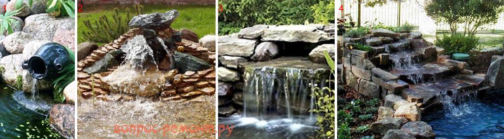 Виды искусственных водопадов, пригодные для самостоятельной постройки, показаны на фото. Поз. 1 – водопад-источник. Эстетические качества минимальные, но и трудов на его сооружение понадобится немного, а расходы, начальные и эксплуатационные, не разорят любой бюджет. Самый же водопадик-родничок как правило экологически вполне вписывается в любой населенный водоем. Для повышения декоративности излив водопада-источника чаще всего выполняют в виде кувшина, амфоры, раковины, фигурок нимф, лягушек и т.п. Воздух в окрестностях дополнительно к пруду практически не увлажняется, но и его потери на испарение счетчик воды почти «не видит». Дополнительной площади не требуется.