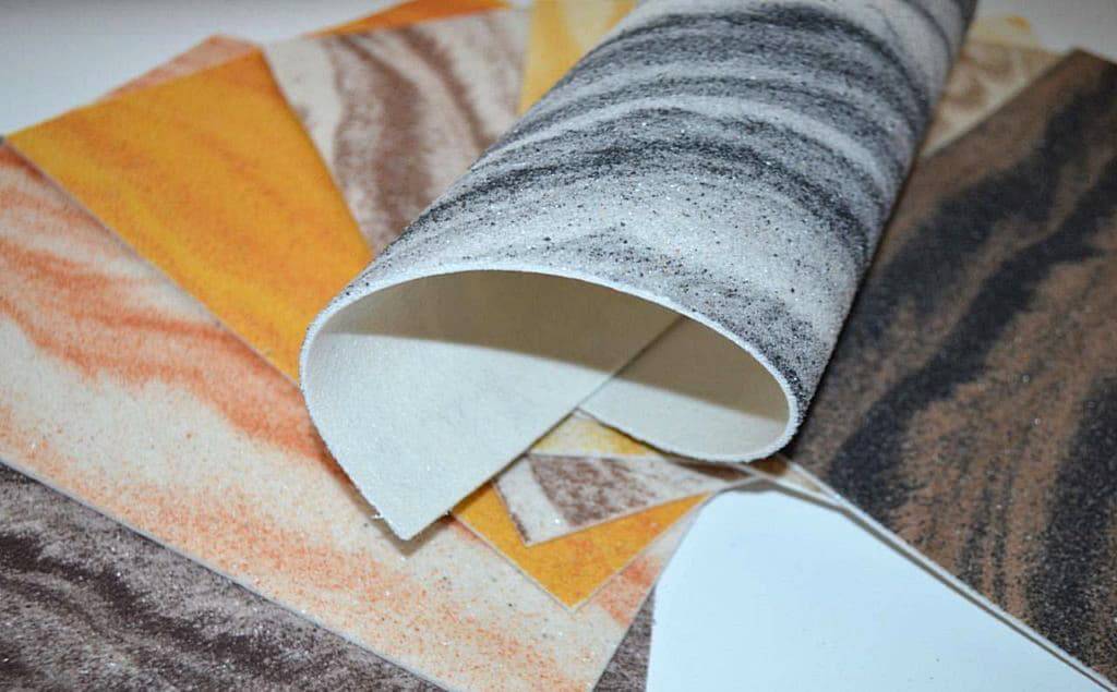 Основу для производства гибкого камня представляет собой песчаник, именно он и есть «фасад» этого отделочного материала. Благодаря песчанику и получают самые интересные, уникальные интерьеры, ведь исходный материал имеет различный оттенок. Толщина его всего-то в пределах одного миллиметра, а остальное – стекловолокно и полимер (высокотемпературный).