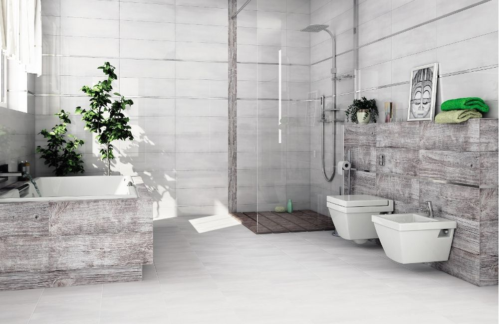 Чёткие линии могут значительно изменить пропорции помещения. Горизонтальная раскладка кафеля чаще всего представляет собой тёмный низ в сочетании со светлым верхом. Также может быть вариант с несколькими горизонтальными полосами разных цветов. При таком дизайне чаще всего используется однотонный кафель.