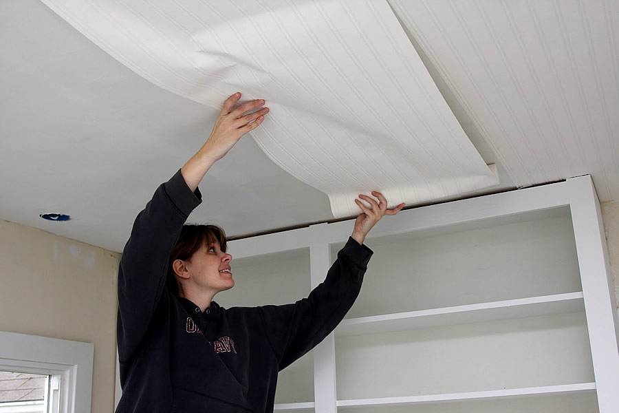 Оклейка проходит так — полотно обоев прикладывают к потолку, обработанному клеем. Потом проходят его шпателем