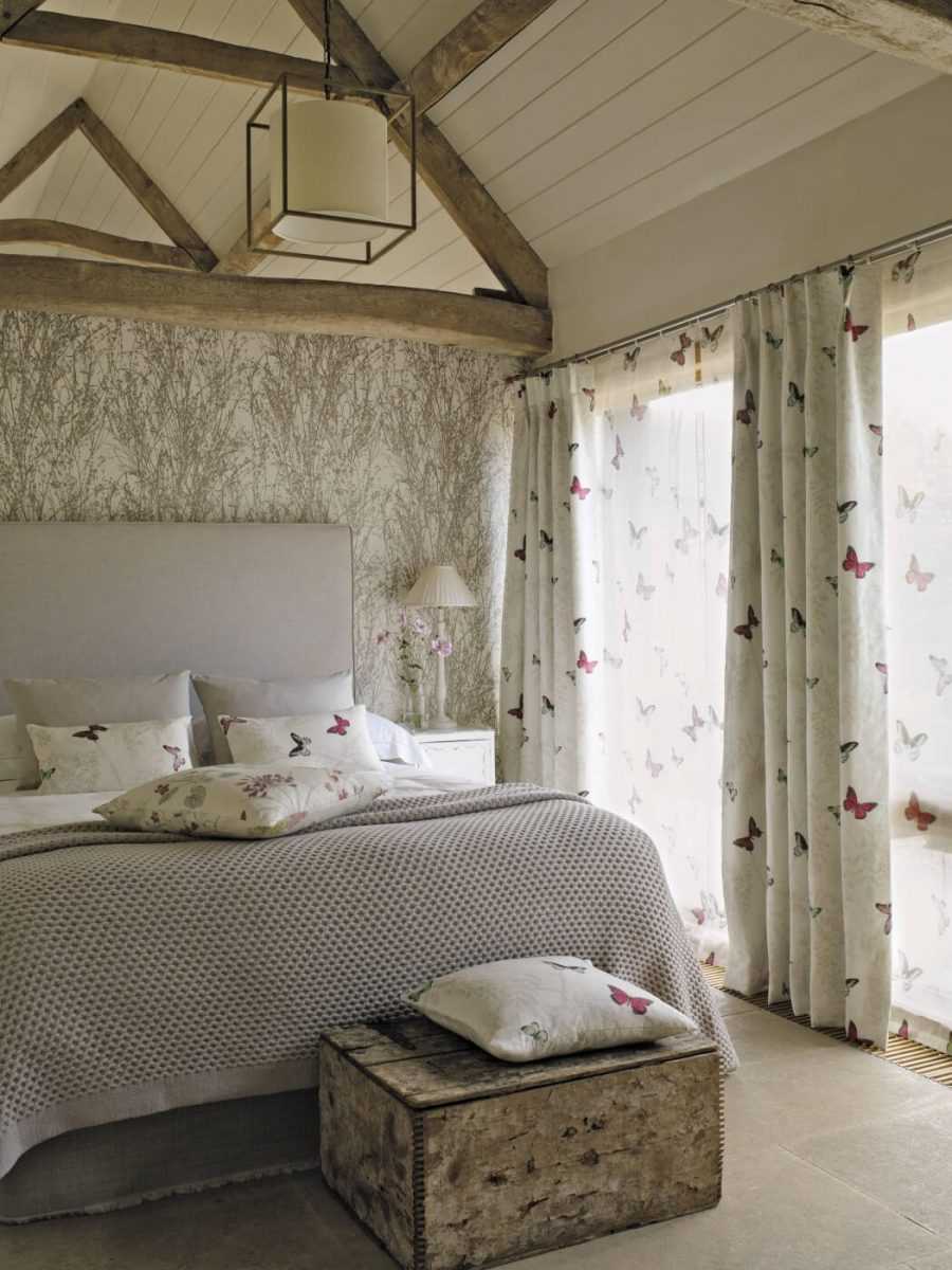 Как и лофт, стиль кантри пришел к нам из США. Это классический вариант деревенского дизайна, для которого чаще всего используются теплые оттенки обоев для спальни.