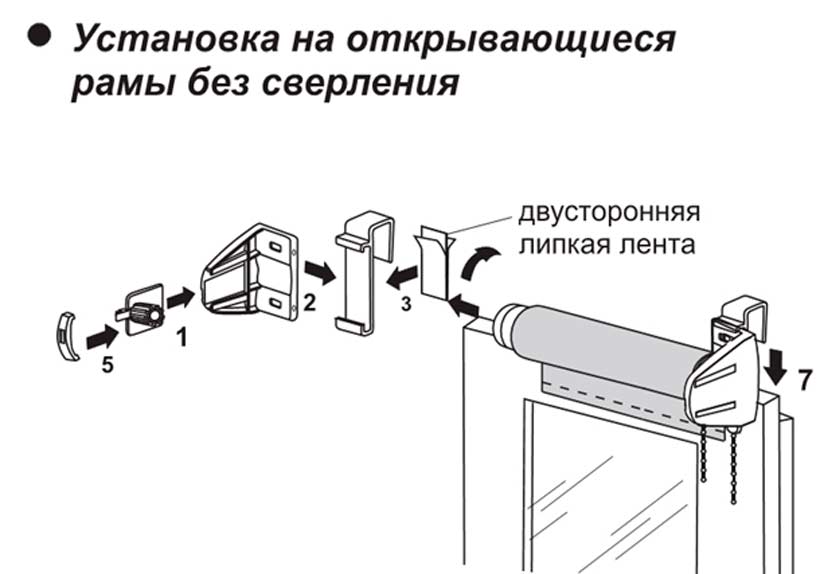 Если выполняется установка на открывающуюся створку, то рулонные жалюзи на пластиковые окна монтируются без сверления в такой последовательности: