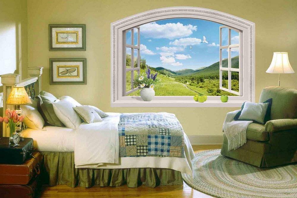 Как вариант — уже готовый рисунок наклеивается поверх стекла, а затем крепится рама. Особенно выигрышно в таком оформлении выглядят пейзажи и цветы — создаётся целостное ощущение наличия окна прямо в стене помещения.