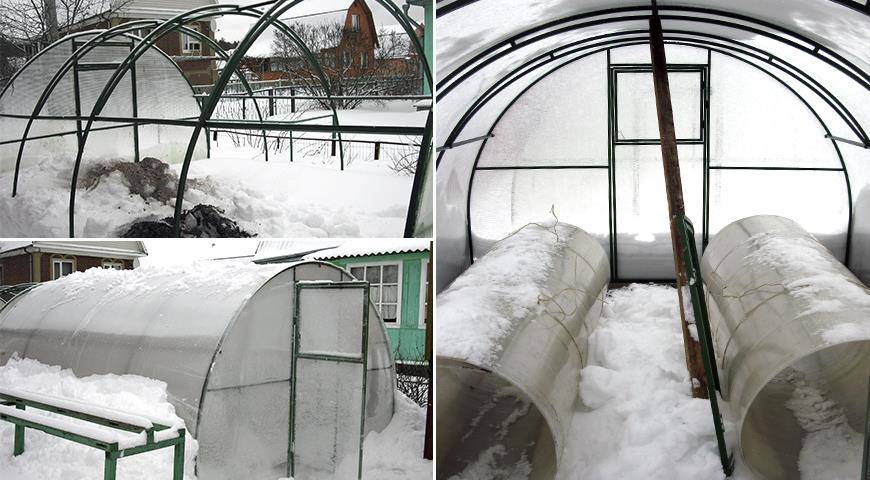 Теплицы делают из достаточно прочных материалов, а их обтекаемая форма предупреждает задержку снега на её поверхности. Но в слишком снежные зимы не исключены непредвиденные ситуации.