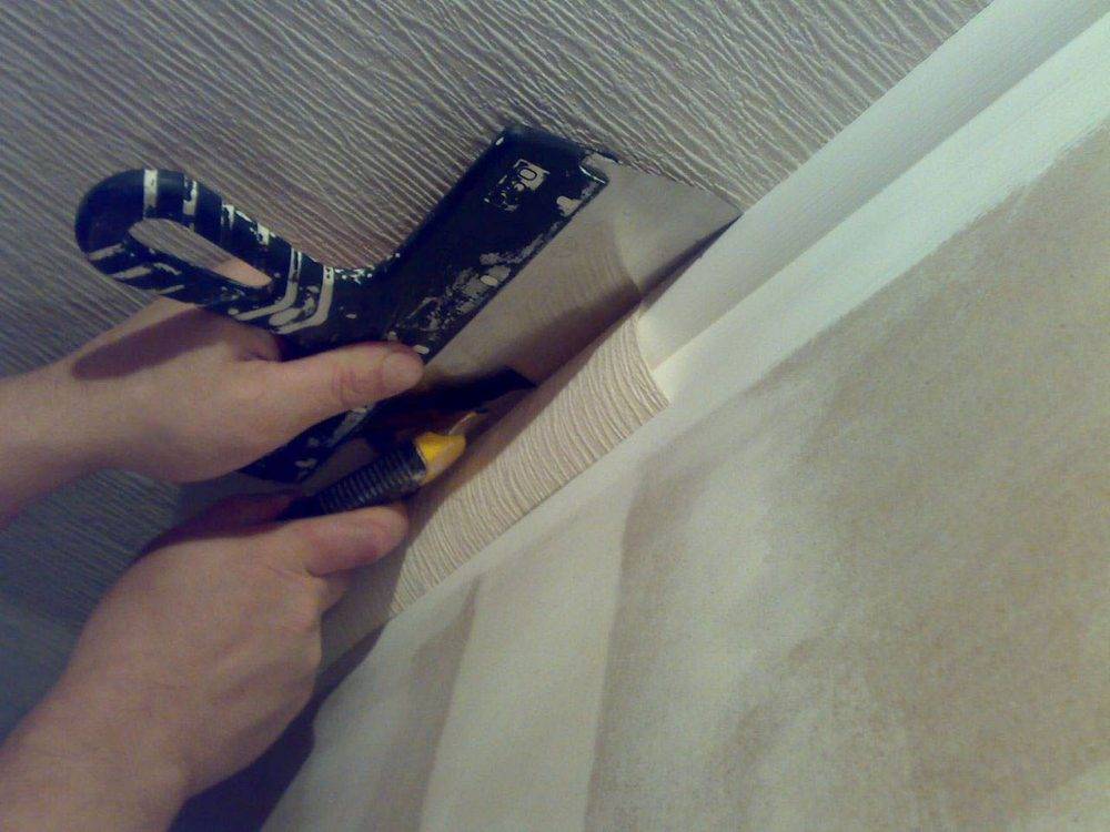 Самую крайнюю полосу, возле стены, предварительно замерить и отрезать. После высыхания, необходимо подрезать лишние отрезки полотна с помощью ножа и шпателя.