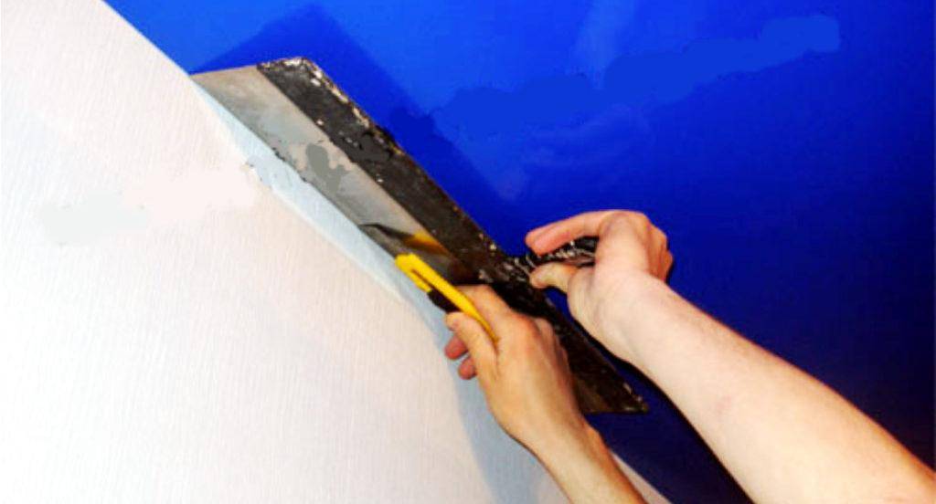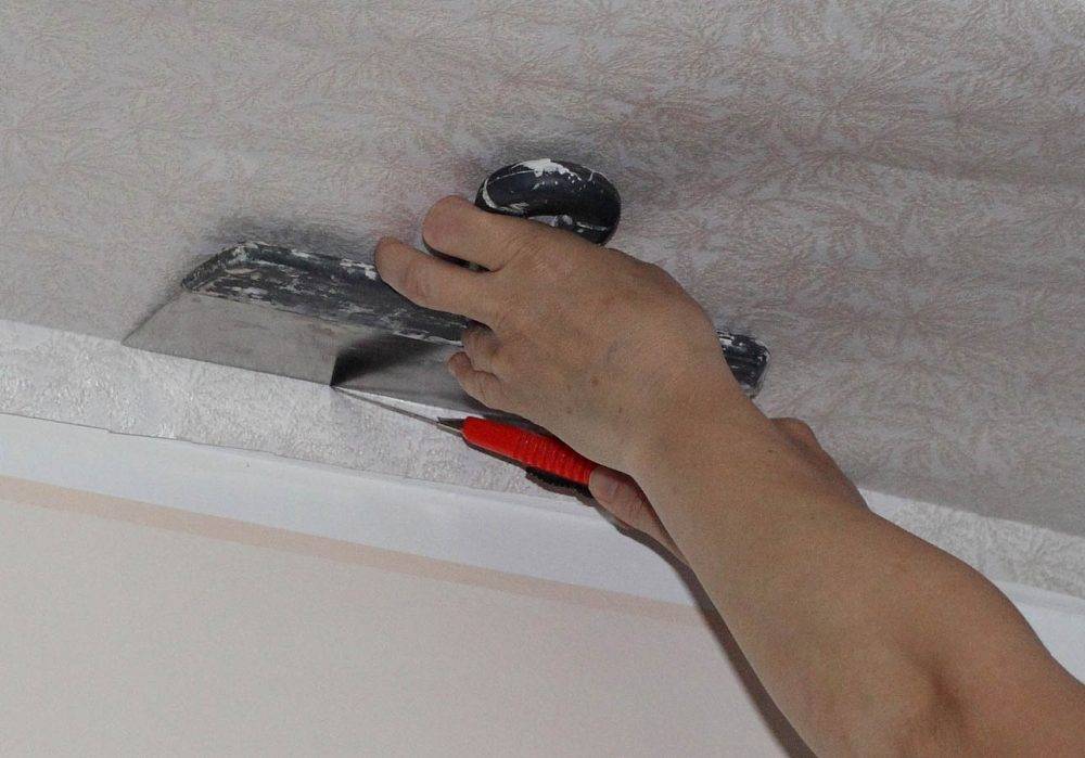 Если профиль натяжного потолка закреплен на устаревшем стеновом материале, то крайне осторожно подрежьте полотно максимально близко к самому профилю. Чтобы свести вероятность повреждения потолочного каркаса к минимуму, просто прикройте лист обоев широким шпателем и подрежьте заостренным ножом