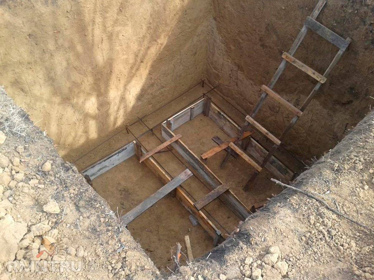 Важно учесть, что выкопать такую яму необходимо немного большего размера, примерно на двадцать сантиметров с каждой стороны. Заливка дна проводится по тому же принципу, что и в ямах с кирпича. Но еще во время армирования под плиту перекрытия, необходимо изготовить 2 петли