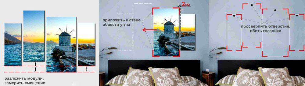 Как правильно располагать модули картины на стене с указанием расстояния между элементами