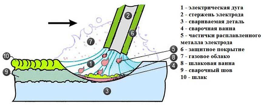 В процессе также горит защитное покрытие, частично плавясь, частично испаряясь и выделяя некоторое количество раскаленных газов. Газы окружают сварную ванну, защищая металл от взаимодействия с кислородом. Их состав зависит от типа защитного покрытия. Расплавленный шлак также покрывает металл, способствуя еще и поддержанию его температуры. Чтобы правильно варить сваркой, необходимо следить за тем, чтобы шлак покрывал сварную ванну.