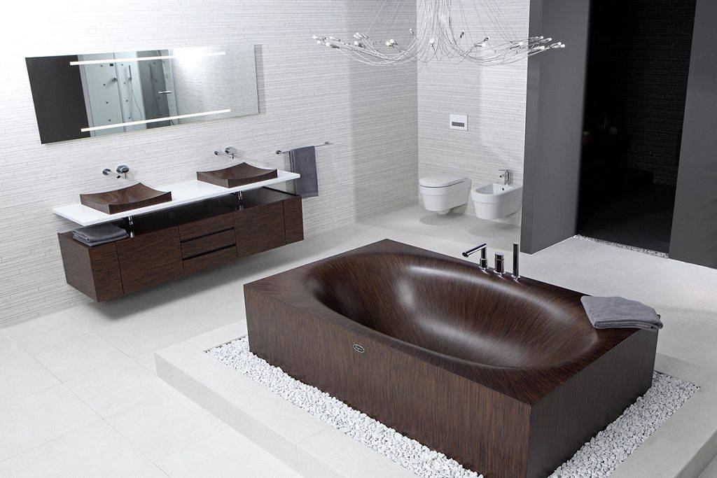 Дерево также хорошо подходит для изготовления ванн. Твердые породы обеспечивают отличную теплоизоляцию, а, например, тиковые ванны еще и ароматическое сопровождение процедур