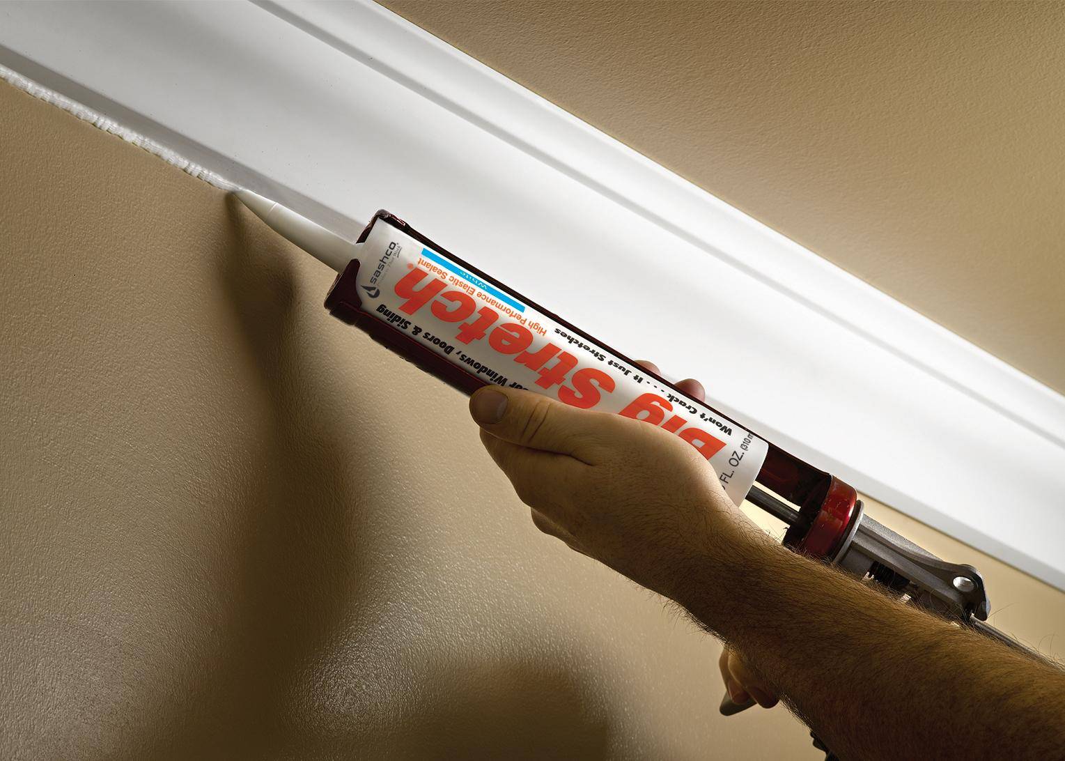 Герметик наносится на обе внутренние поверхности багета так, чтобы плинтус приклеился одновременно и к потолку и к стене. Если монтаж выполняется на готовые обои, то количество герметика кладётся такое, чтобы он во время прижима к стенам и потолку не выдавливается из стыка наружу, чтобы не запачкать обои или краску.