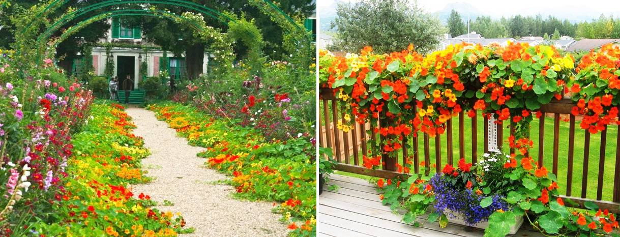 Вариант для Волго-Вятского, Центрального района, территорий с переменчивым климатом – настурция. Эти цветы с нежными, зелеными листьями разных оттенков и цветками-колокольчиками ярких расцветок, цветут с июня до самых морозов. Даже выпавший снег прикрывает растения сугробами, но холода не вызывают традиционного увядания. Они бывают кустовые, невысокие, которые высаживают как бордюрное растение. Или гигантские лианы до 3 м, которые можно пускать по беседке, подвязывать на шнуры, шпалеры.