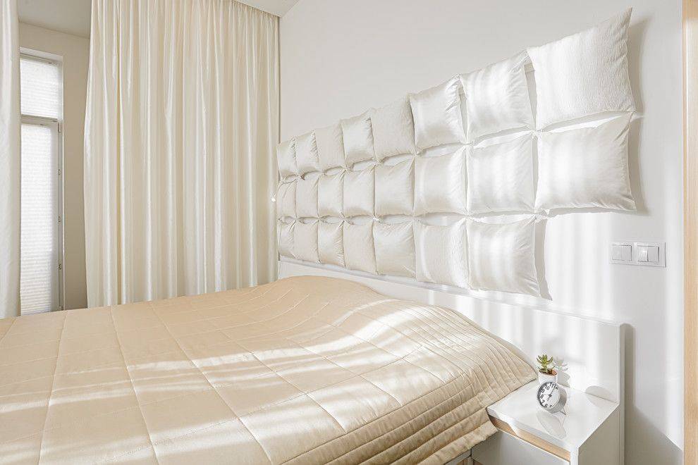 В спальне, выполненной в стиле минимализм, стеклянная перегородка за изголовьем кровати отделяет рабочую зону. Стиль требует использование минимального количество деталей, поэтому дизайнер решил использовать стекло, чтобы не нарушать целостность комнаты и не «разрывать» её дополнительными стенами.