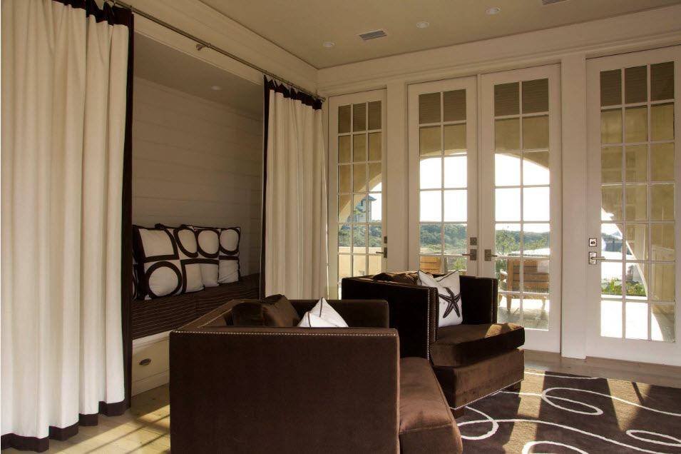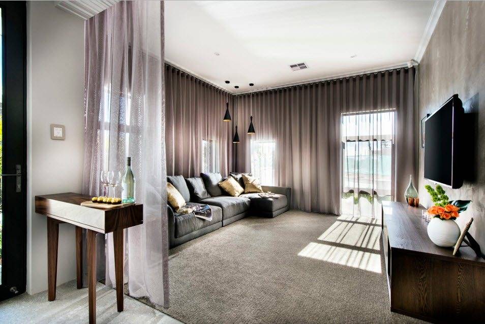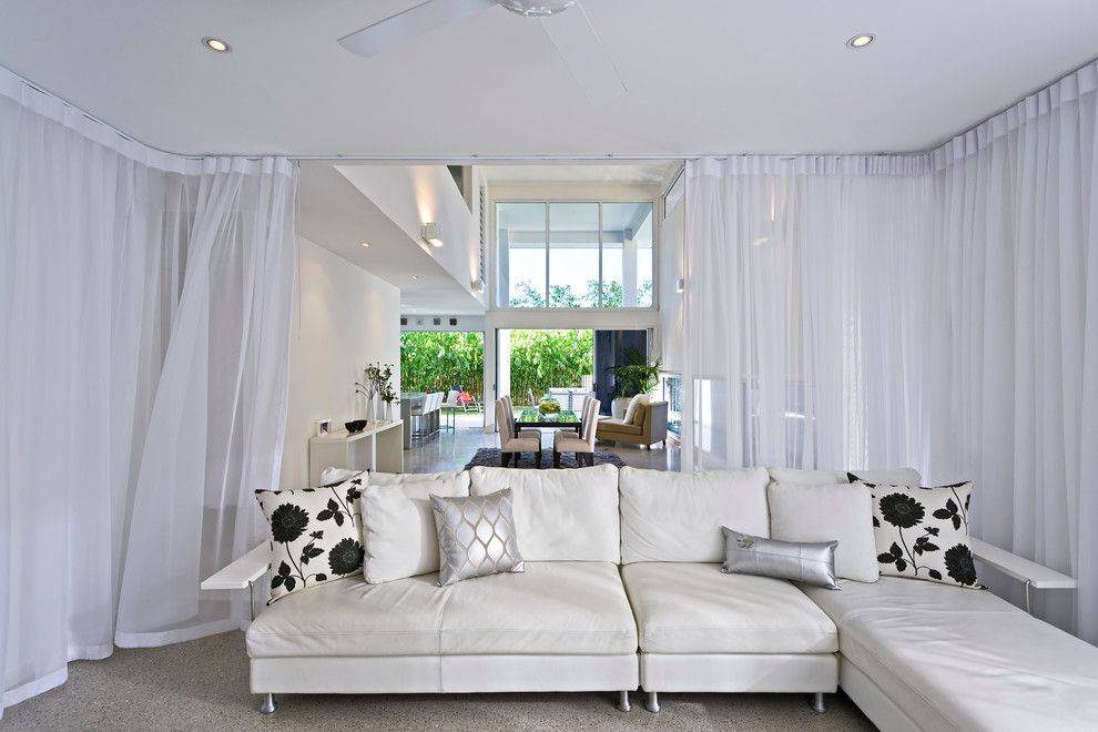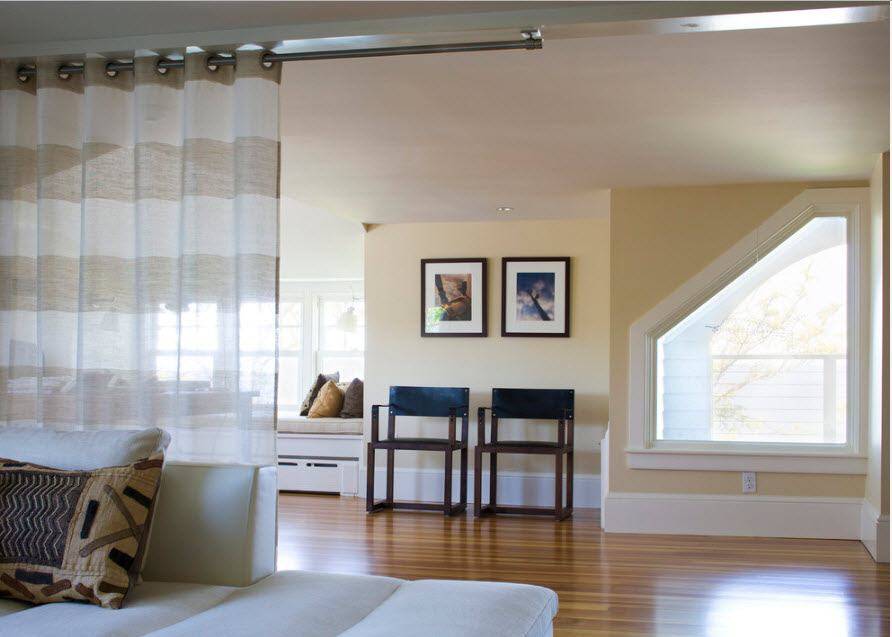 Вариантов композиционного зонирования шторами большое количество. Подобный способ деления пространства легко воплотим, экономичен, помогает наполнить пространство домашним уютом и особой атмосферой.