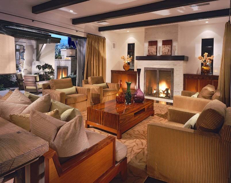 Конструкция не только зонирует помещение, но и является важной декоративной частью интерьера, также в неё вмонтирован биокамин