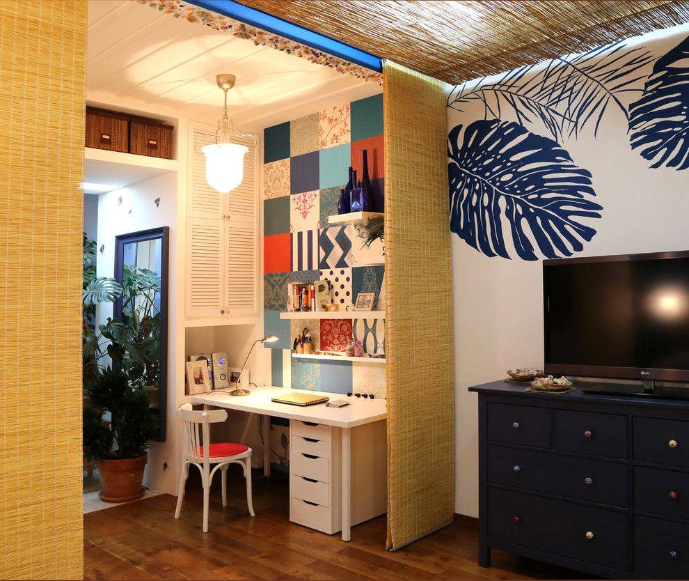 - рабочее место – обычно располагается ближе к окну и может отделяться нитяными шторами, сплошной занавесью без волн, иногда римскими жалюзи;