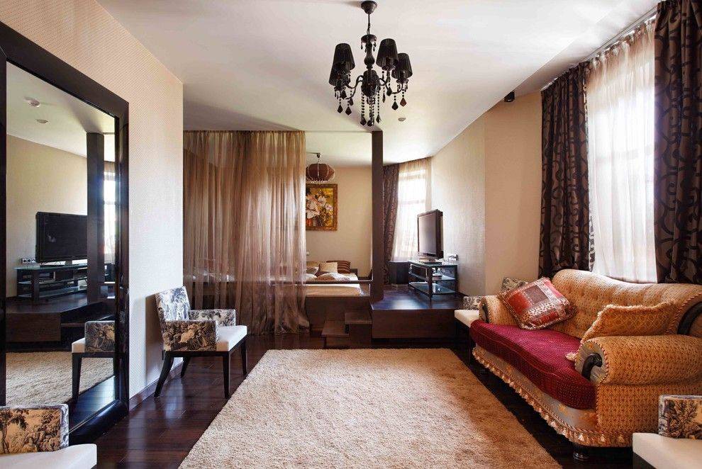 Рассмотрим способы разделения пространства в гостиной, спальне, кухне, детской и студии.