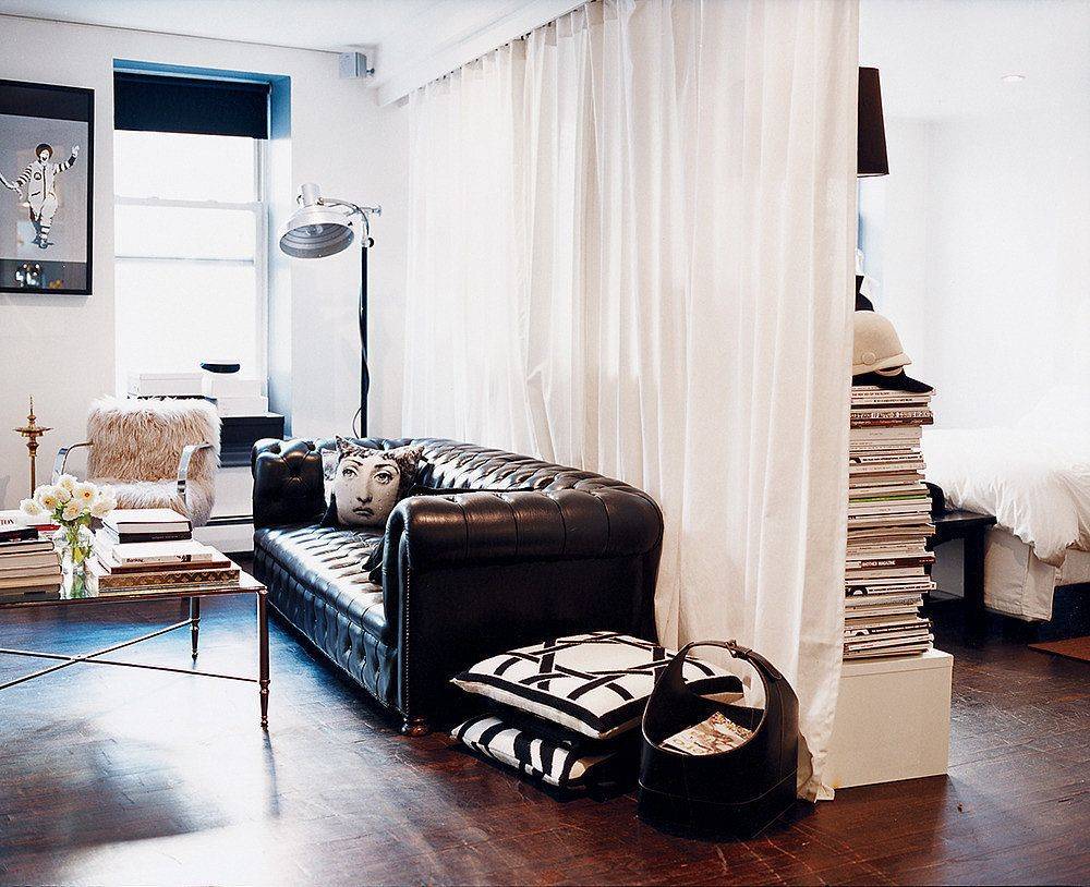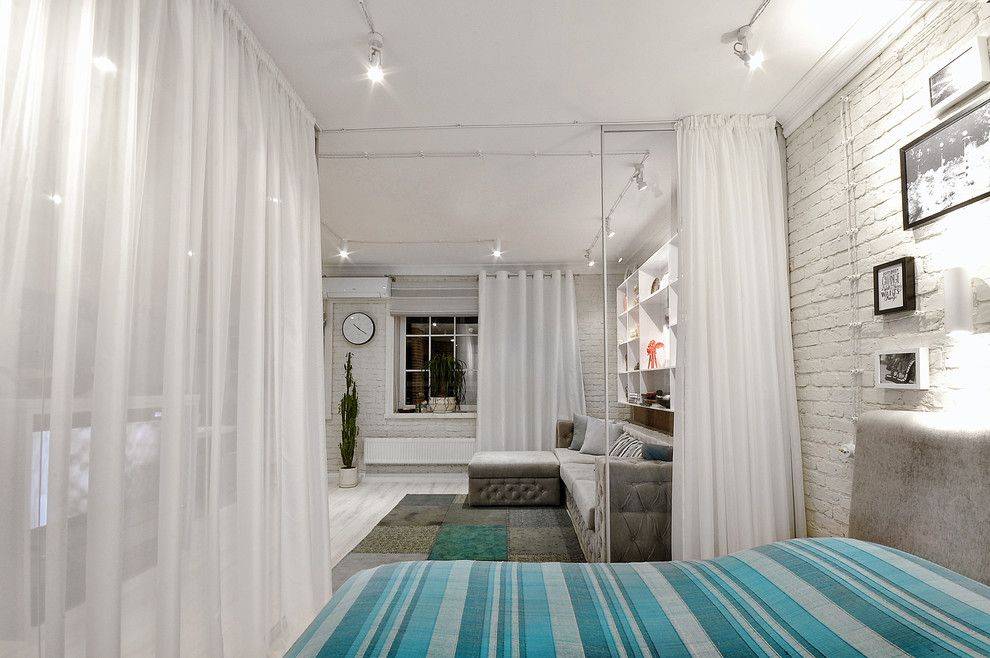 Квартира-студия – это целое пространство для реализации интересных дизайнерских решений творческих людей. Именно в таком помещении вопрос зонирования стоит на первом плане. И если вы не располагаете достаточным бюджетом для возведения какой-нибудь дизайнерской перегородки, то шторы в данном случае – оптимальный вариант, эстетика которого ничуть не уступает предыдущему.