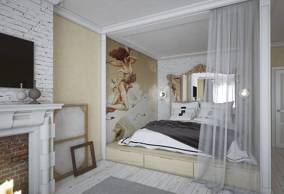 Если перенести какую-нибудь зону на подиум, она автоматически станет отдельным пространством. Но если вы хотите усилить визуальный эффект, можно дополнить данный способ зонирования перегородкой, шторами либо цветом. Последний вариант подойдет в том случае, если комната у вас оформлена в едином цвете, например, белом, а подиум, с оборудованной на нем зоной, вы сделаете в других тонах.