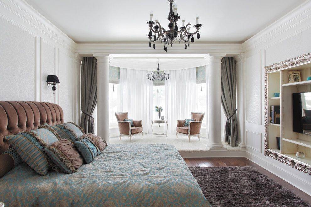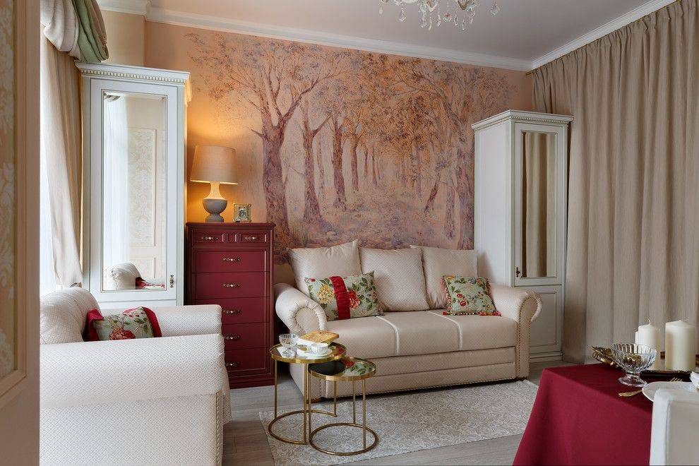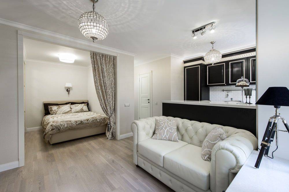 В одной комнате совмещены гостиная и спальня, чтобы подчеркнуть разное назначение частей пространства, она поделена на две равные часть вспомогательной перегородкой. При этом сохраняется общность пространства. Отделка возведённой стены в классическом стиле дополняет декоративную атмосферу интерьера.