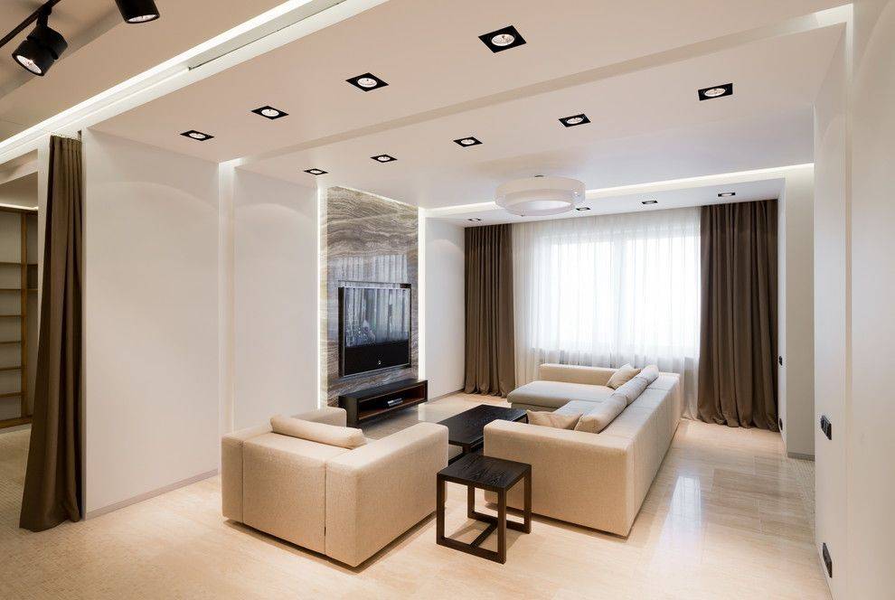 В данном случае возведена небольшая зонирующая конструкция возле стены с окнами. Она подчёркивает условную линию разграничения между кухней и гостиной. Дизайнер применил также потолочное зонирование: в потолок встроена линейная подсветка, явно указывающая на границу.