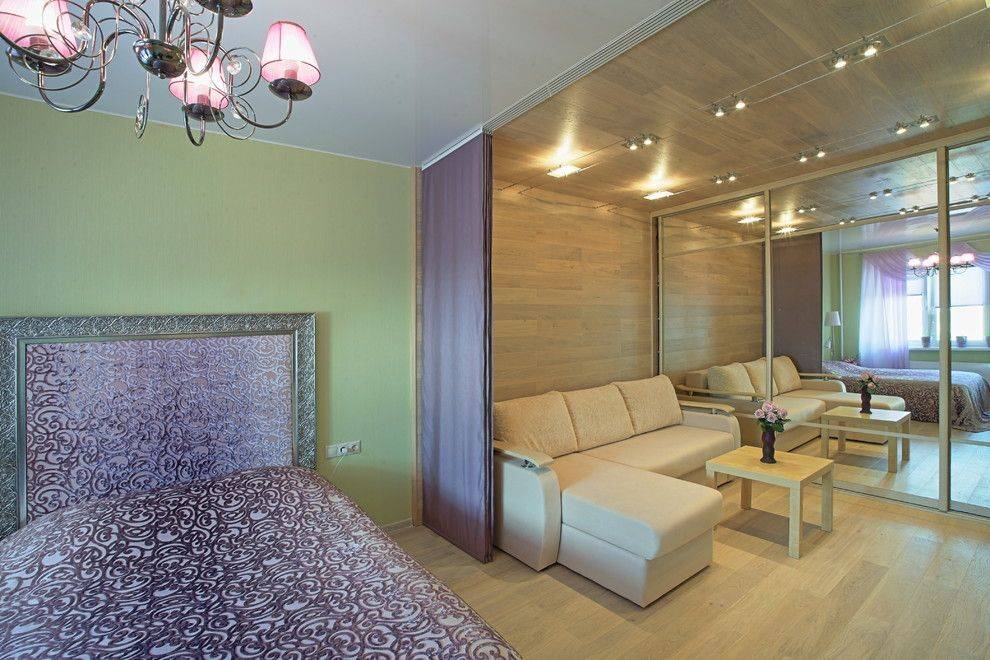 Еще один интересный вариант – установить туалетный столик с большим зеркалом, в котором будет отображаться противоположная стена. Таким образом, вы сможете не только создать два отдельные друг от друга зоны, но и зрительно расширить пространство маленькой комнаты.